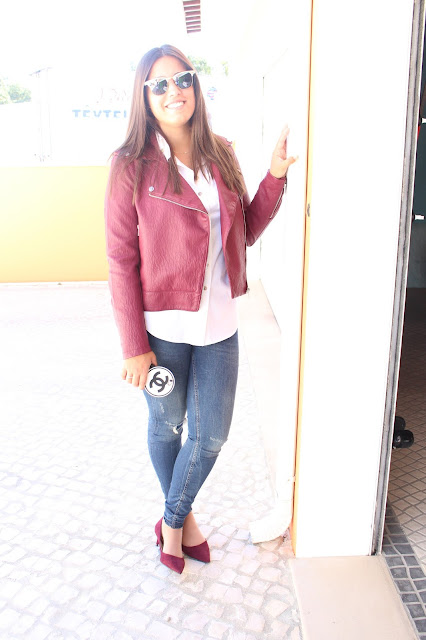 Casaco: STRADIVARIUS | Camisa: SAHOCO | Jeans e Stilettos: ZARA | Relógio: MICHAEL KORS | Mala: MOSCHINO | Óculos: RAY BAN